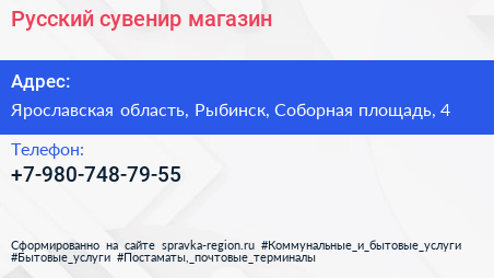 Русский сувенир, магазин по адресу Ярославская область, Рыбинск, Соборная площадь, 4 в дальнейшем Организация, размещена в следующих категориях: