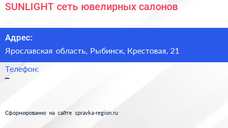 SUNLIGHT, сеть ювелирных салонов по адресу Ярославская область, Рыбинск, Крестовая, 21 в дальнейшем Организация, размещена в следующих категориях: