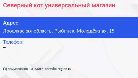 Северный кот, универсальный магазин по адресу Ярославская область, Рыбинск, Молодёжная, 15 в дальнейшем Организация, размещена в следующих категориях: