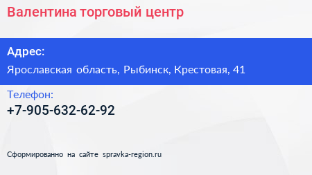 Валентина, торговый центр по адресу Ярославская область, Рыбинск, Крестовая, 41 в дальнейшем Организация, размещена в следующих категориях: