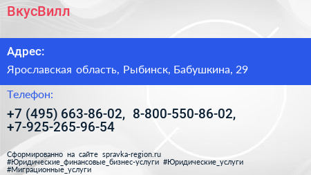 ВкусВилл по адресу Ярославская область, Рыбинск, Бабушкина, 29 в дальнейшем Организация, размещена в следующих категориях: