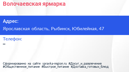 Волочаевская, ярмарка по адресу Ярославская область, Рыбинск, Юбилейная, 47 в дальнейшем Организация, размещена в следующих категориях: