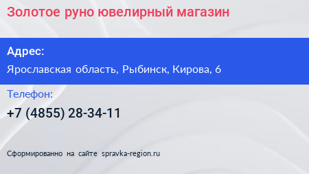Золотое руно, ювелирный магазин по адресу Ярославская область, Рыбинск, Кирова, 6 в дальнейшем Организация, размещена в следующих категориях: