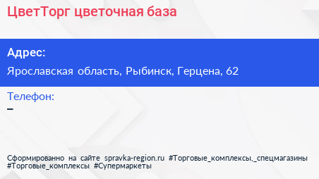 ЦветТорг, цветочная база по адресу Ярославская область, Рыбинск, Герцена, 62 в дальнейшем Организация, размещена в следующих категориях: