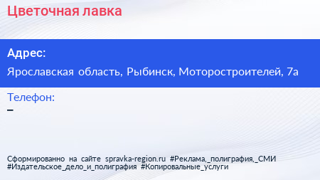 Цветочная лавка по адресу Ярославская область, Рыбинск, Моторостроителей, 7а в дальнейшем Организация, размещена в следующих категориях: