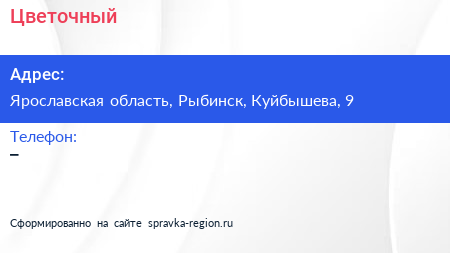 Цветочный по адресу Ярославская область, Рыбинск, Куйбышева, 9 в дальнейшем Организация, размещена в следующих категориях: