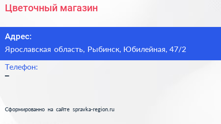 Цветочный магазин по адресу Ярославская область, Рыбинск, Юбилейная, 47/2 в дальнейшем Организация, размещена в следующих категориях: