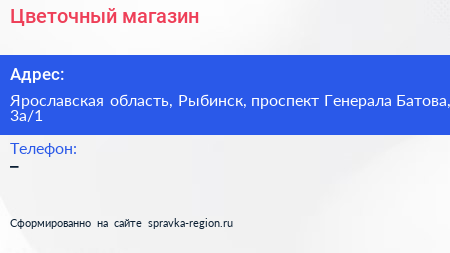 Цветочный магазин по адресу Ярославская область, Рыбинск, проспект Генерала Батова, 3а/1 в дальнейшем Организация, размещена в следующих категориях: