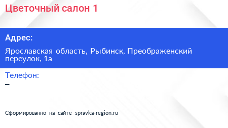 Цветочный салон 1 по адресу Ярославская область, Рыбинск, Преображенский переулок, 1а в дальнейшем Организация, размещена в следующих категориях: