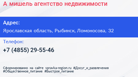 А`мишель, агентство недвижимости по адресу Ярославская область, Рыбинск, Ломоносова, 32 в дальнейшем Организация, размещена в следующих категориях: