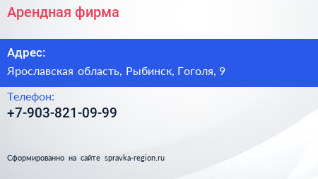 Арендная фирма по адресу Ярославская область, Рыбинск, Гоголя, 9 в дальнейшем Организация, размещена в следующих категориях: