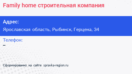 Family home, строительная компания по адресу Ярославская область, Рыбинск, Герцена, 34 в дальнейшем Организация, размещена в следующих категориях: