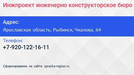 Инжпроект, инженерно-конструкторское бюро по адресу Ярославская область, Рыбинск, Чкалова, 64 в дальнейшем Организация, размещена в следующих категориях: