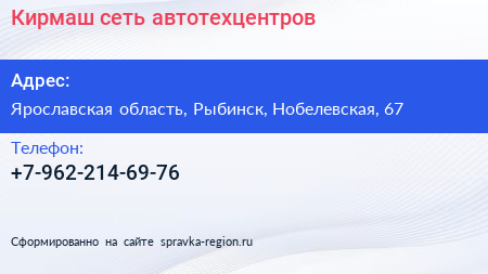 Кирмаш, сеть автотехцентров по адресу Ярославская область, Рыбинск, Нобелевская, 67 в дальнейшем Организация, размещена в следующих категориях: