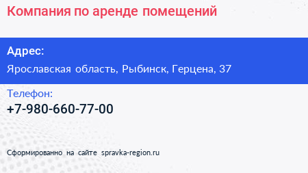 Компания по аренде помещений по адресу Ярославская область, Рыбинск, Герцена, 37 в дальнейшем Организация, размещена в следующих категориях: