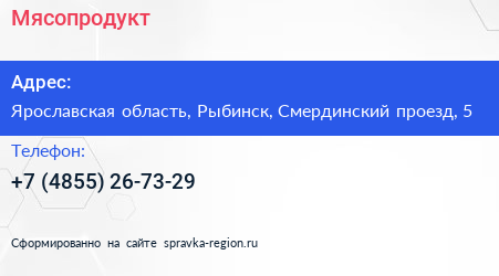 Мясопродукт по адресу Ярославская область, Рыбинск, Смердинский проезд, 5 в дальнейшем Организация, размещена в следующих категориях: