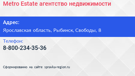 Metro Estate, агентство недвижимости по адресу Ярославская область, Рыбинск, Свободы, 8 в дальнейшем Организация, размещена в следующих категориях: