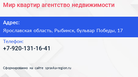 Мир квартир, агентство недвижимости по адресу Ярославская область, Рыбинск, бульвар Победы, 17 в дальнейшем Организация, размещена в следующих категориях: