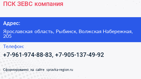 ПСК ЗЕВС, компания по адресу Ярославская область, Рыбинск, Волжская Набережная, 205 в дальнейшем Организация, размещена в следующих категориях: