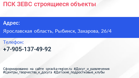 ПСК ЗЕВС, строящиеся объекты по адресу Ярославская область, Рыбинск, Захарова, 26/4 в дальнейшем Организация, размещена в следующих категориях: