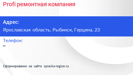 Profi, ремонтная компания по адресу Ярославская область, Рыбинск, Герцена, 23 в дальнейшем Организация, размещена в следующих категориях: