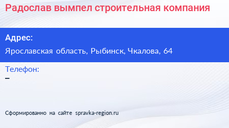 Радослав вымпел, строительная компания по адресу Ярославская область, Рыбинск, Чкалова, 64 в дальнейшем Организация, размещена в следующих категориях: