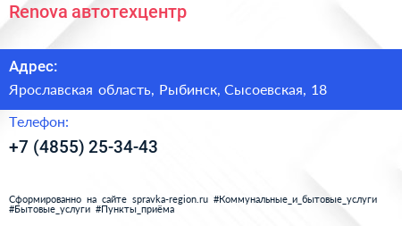 Renova, автотехцентр по адресу Ярославская область, Рыбинск, Сысоевская, 18 в дальнейшем Организация, размещена в следующих категориях: