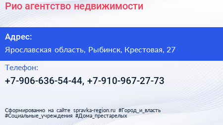 Рио, агентство недвижимости по адресу Ярославская область, Рыбинск, Крестовая, 27 в дальнейшем Организация, размещена в следующих категориях: