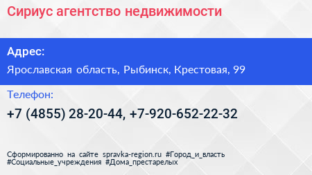 Сириус, агентство недвижимости по адресу Ярославская область, Рыбинск, Крестовая, 99 в дальнейшем Организация, размещена в следующих категориях: