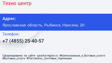 Техно-центр по адресу Ярославская область, Рыбинск, Нансена, 20 в дальнейшем Организация, размещена в следующих категориях: