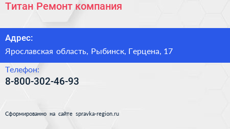 Титан Ремонт, компания по адресу Ярославская область, Рыбинск, Герцена, 17 в дальнейшем Организация, размещена в следующих категориях: