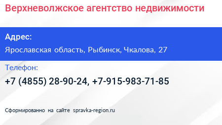 Верхневолжское агентство недвижимости по адресу Ярославская область, Рыбинск, Чкалова, 27 в дальнейшем Организация, размещена в следующих категориях: