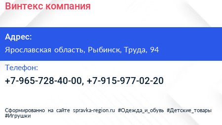 Винтекс, компания по адресу Ярославская область, Рыбинск, Труда, 94 в дальнейшем Организация, размещена в следующих категориях: