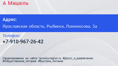 А`Мишель по адресу Ярославская область, Рыбинск, Ломоносова, 5а в дальнейшем Организация, размещена в следующих категориях: