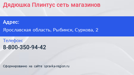 Дядюшка Плинтус, сеть магазинов по адресу Ярославская область, Рыбинск, Суркова, 2 в дальнейшем Организация, размещена в следующих категориях: