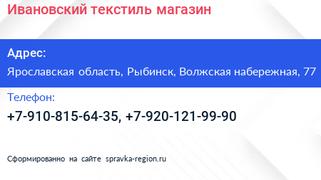Ивановский текстиль, магазин по адресу Ярославская область, Рыбинск, Волжская набережная, 77 в дальнейшем Организация, размещена в следующих категориях: