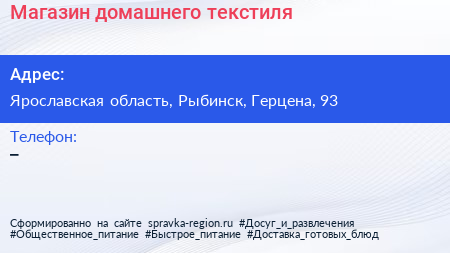 Магазин домашнего текстиля по адресу Ярославская область, Рыбинск, Герцена, 93 в дальнейшем Организация, размещена в следующих категориях: