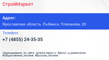 СтройМаркет по адресу Ярославская область, Рыбинск, Плеханова, 20 в дальнейшем Организация, размещена в следующих категориях: