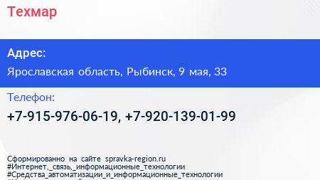 Техмар по адресу Ярославская область, Рыбинск, 9 мая, 33 в дальнейшем Организация, размещена в следующих категориях:
