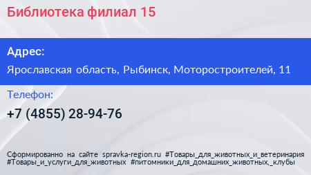 Библиотека, филиал №15 по адресу Ярославская область, Рыбинск, Моторостроителей, 11 в дальнейшем Организация, размещена в следующих категориях: