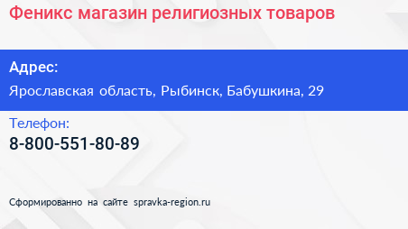 Феникс, магазин религиозных товаров по адресу Ярославская область, Рыбинск, Бабушкина, 29 в дальнейшем Организация, размещена в следующих категориях: