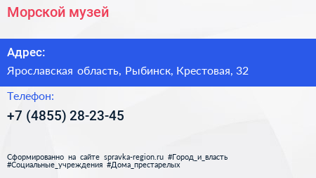 Морской музей по адресу Ярославская область, Рыбинск, Крестовая, 32 в дальнейшем Организация, размещена в следующих категориях: