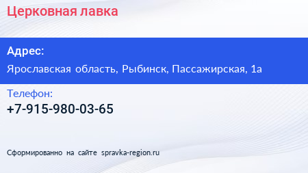 Церковная лавка по адресу Ярославская область, Рыбинск, Пассажирская, 1а в дальнейшем Организация, размещена в следующих категориях: