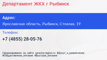 Департамент ЖКХ, г. Рыбинск по адресу Ярославская область, Рыбинск, Стоялая, 19 в дальнейшем Организация, размещена в следующих категориях: