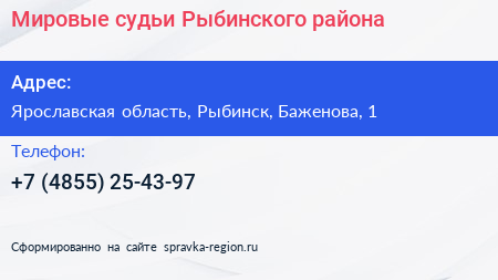 Мировые судьи Рыбинского района по адресу Ярославская область, Рыбинск, Баженова, 1 в дальнейшем Организация, размещена в следующих категориях: