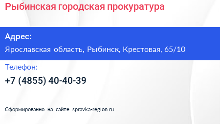 Рыбинская городская прокуратура по адресу Ярославская область, Рыбинск, Крестовая, 65/10 в дальнейшем Организация, размещена в следующих категориях: