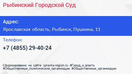 Рыбинский Городской Суд по адресу Ярославская область, Рыбинск, Пушкина, 11 в дальнейшем Организация, размещена в следующих категориях: