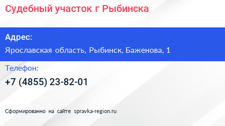 Судебный участок г. Рыбинска по адресу Ярославская область, Рыбинск, Баженова, 1 в дальнейшем Организация, размещена в следующих категориях: