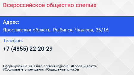 Всероссийское общество слепых по адресу Ярославская область, Рыбинск, Чкалова, 35/16 в дальнейшем Организация, размещена в следующих категориях: