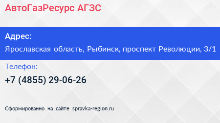 АвтоГазРесурс, АГЗС по адресу Ярославская область, Рыбинск, проспект Революции, 3/1 в дальнейшем Организация, размещена в следующих категориях: